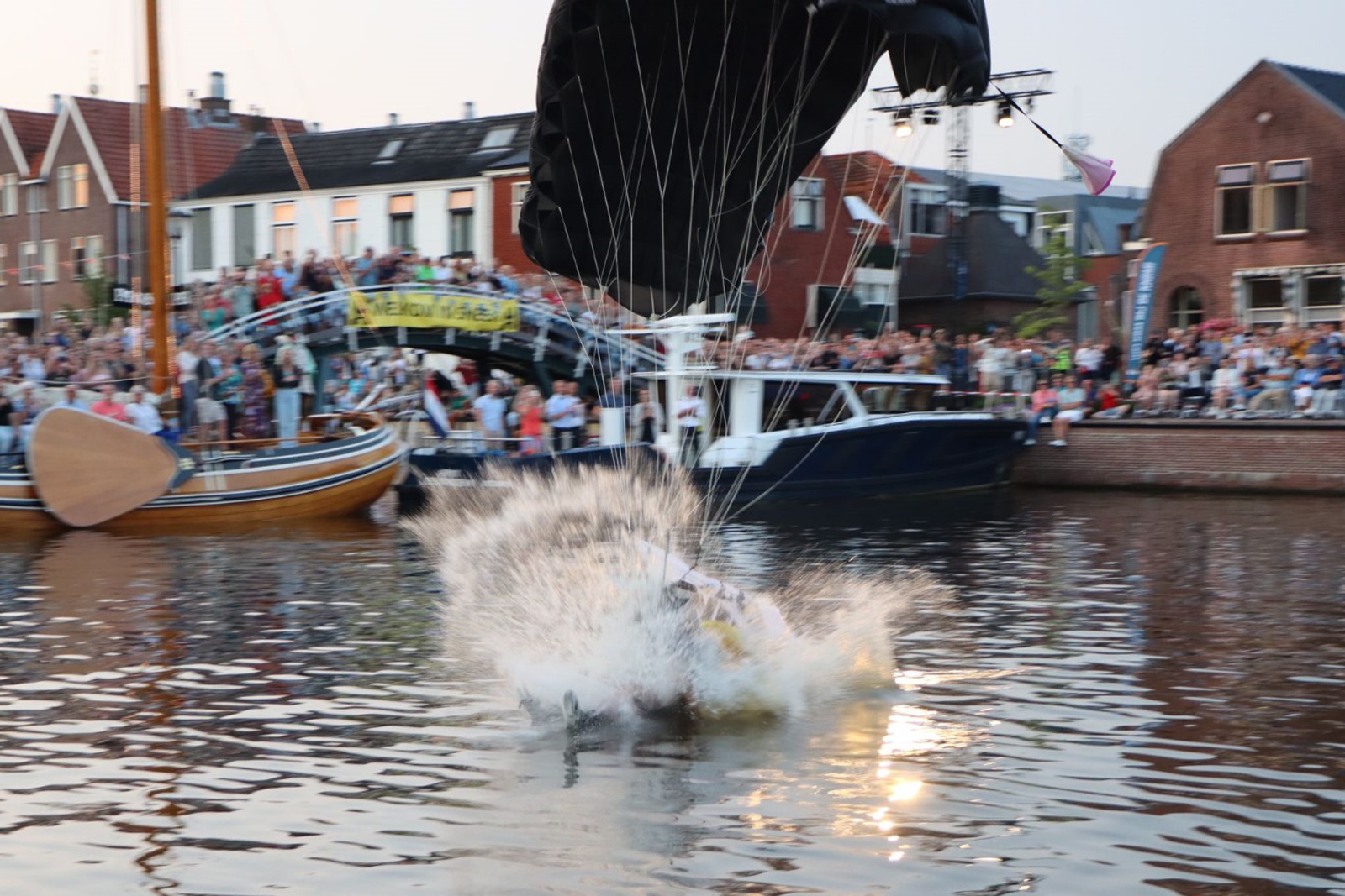 – Een parachutist komt de boodschappen in een boodschappentas bezorgen bij een kookprogramma voor de televisie.